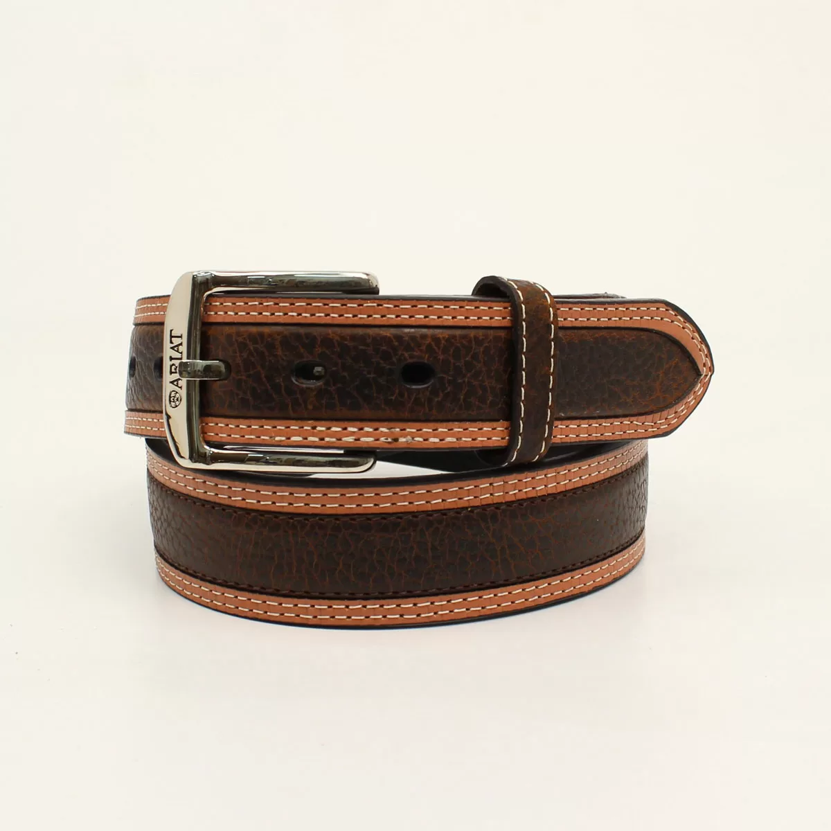 - This Ariat belt by M&F Western Products features an oiled brown colored strap, with a chrome buckle. This belt also comes with reinforced belt holes for a long lasting belt. Available in sizes 32-46.